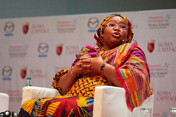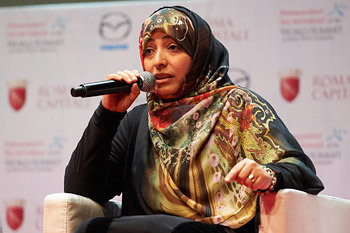 Nobel Laureate Tawakkol Karman speaking during the second discussion of the 14th World Summit of Nobel Peace Laureates in Rome, Italy on December 12, 2014. Photo/Olivier Adam