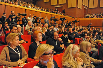 Members of the audience attending the first day of the 14th World Summit of Nobel Peace Laureates at the Auditorium Parco della Musica in Rome, Italy on December 12, 2014.