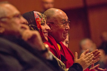 Of her experience in Liberia, Leymah Gbowee told the audience that she had been angry with the situation. She likened anger to a liquid that can be poured into a non-violent vessel as His Holiness has done or into a violent one with the result that you end up in jail like Charles Taylor. However, she said she’d learned that when you’re angry, you should first take a step back. She explained how during the peace negotiations in Liberia, she and her women companions sat down outside the negotiating hall saying that they would not allow the Liberian delegates to leave until they reached an agreement.