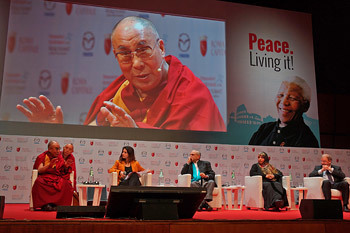 The second session, focussing on ‘Living Peace for Human Development - Threats to Sustainable Human Development’ was moderated by Yalda Hakim, correspondent with BBC World. She began by inviting His Holiness to explain how peace is more than an absence of war. He began by saying that he felt the other Peace Laureates were more experienced than he was, but stated: