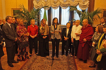 Italian Parliament speaker Laura Bodrini with His Holiness the Dalai Lama and fellow Nobel Laureates during a luncheon hosted by the Italian Parliament Chamber of Deputies in Rome, Italy on December 12, 2014. Photo/Jeremy Russell/OHHDL