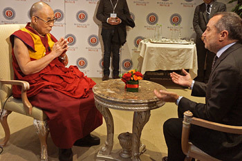 Franco de Mare of RAI television interviewing His Holiness the Dalai Lama in Rome, Italy on December 12, 2014. Photo/Jeremy Russell/OHHDL