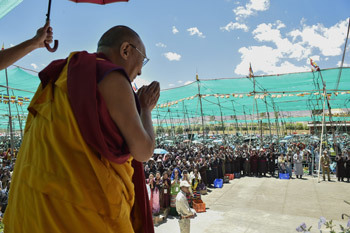Leh, Ladakh, J&K, India, 10 July 2014 - His Holiness the Dalai Lama went to the teaching pavilion early in the morning today and spent four hours performing the self-generation rituals. When he returned from lunch, in the heat of the day, an estimated 144,000 people had gathered to take part in the preparatory procedures for the Kalachakra Empowerment. He came out to the front of the platform of the pavilion to gaze out into the crowd smiling and waving in greeting and the audience returned his salute. Inside the pavilion he greeted the Lamas and dignitaries, among them Ganden Tri Rinpoche, Sakya Dungsey Rinpoche, Drikung Chetsang Rinpoche and Sikyong Lobsang Sangay.