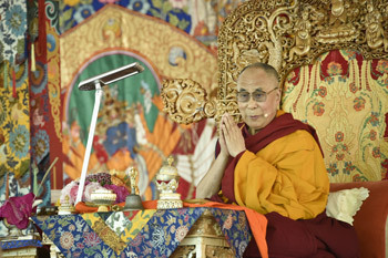 His Holiness the Dalai Lama speaking during the preparatory procedures of the 33rd Kalachakra Empowerment in Leh, Ladakh, J&K, India on July 10, 2014. Photo/Manuel Bauer