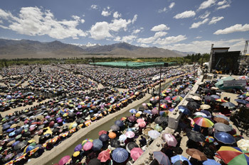 A view of the teaching ground with a crowd of over 140,000 people attending the preparatory procedures of His Holiness the Dalai Lama's 33rd Kalachakra Empowerment in Leh, Ladakh, J&K, India on July 10, 2014. Photo/Manuel Bauer