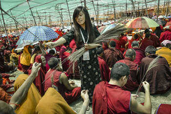 A volunteer handing out kusha grass, part of the preparatory procedures of the 33rd Kalachakra Empowerment in Leh, Ladakh, J&K, India on July 10, 2014. Photo/Manuel Bauer