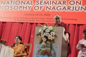 His Holiness the Dalai Lama speaking at the inauguration of the National Seminar on the Philosophy of Nagarjuna at Pt. Ravishankar Shulkla University in Raipur, Chattisgarh on January 13, 2014. Photo/Tenzin Choejor/OHHDL