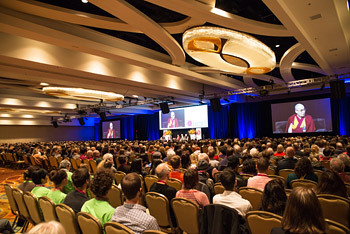 Boston, MA, USA, 31 October 2014 - Today, His Holiness the Dalai Lama was welcomed by his old friends, Richard Davidson and President of the Mind & Life Institute Arthur Zajonc as he arrived to take part in the 2nd International Symposium for Contemplative Studies (ISCS). In his introduction, Dr Davidson spoke of his feelings as he looked out at the audience of 1700 in the hall recalling how few were involved 27 years ago when he, Daniel Goleman and Francisco Varela began discussions that would become the Mind & Life Institute. Representatives of 23 countries were present today in a body of interested people twice the size of the first meeting of ISCS. His Holiness responded: