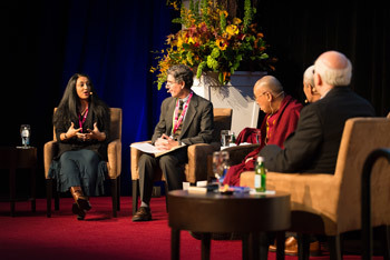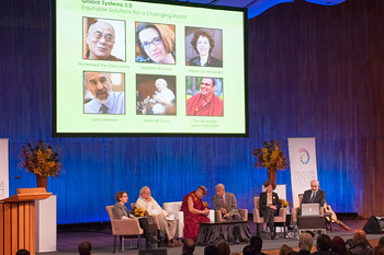 The first panel discussion on Global Systems 3.0: Equitable Solutions for a Changing World organized by The Dalai Lama Centre for Ethics and Transformative Values at MIT's Kresge Auditorium in Cambridge, MA, USA on October 31, 2014. Photo/Brian Lima