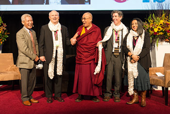 His Holiness's interpreter Thupten Jinpa, and panelists Arthur Zojonc, His Holiness the Dalai Lama, Richard Davidson and Amishi Jha at the conclusion of the 2nd International Symposium for Contemplative Studies organized by the Mind & Life Institute in Boston, MA, USA on October 31, 2014. Photo/Jurek Schreiner