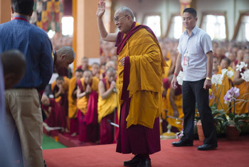 His Holiness the Dalai Lama waving to the audience at the start of the second day of his teachings at Ganden Jangtse Monastery in Mundgod, India on December 24, 2014. Photo/Tenzin Choejor/OHHDL