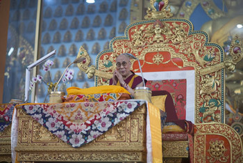 His Holiness the Dalai Lama during the second day of his teachings at Ganden Jangtse Monastery in Mundgod, India on December 24, 2014. Photo/Tenzin Choejor/OHHDL