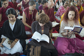 Members of the audience following the text during the second day of His Holiness the Dalai Lama's teachings at Ganden Jangtse Monastery in Mundgod, India on December 24, 2014. Photo/Tenzin Choejor/OHHDL