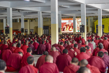 Mundgod, Karnataka, India, 24 December 2014 - “In this prayer that the Lama recites it says there’s nothing better to listen to,” said His Holiness the Dalai Lama at the start of the second day of the ‘Stages of the Path’ teachings he is giving at Ganden Jangtse Monastery, “than the sound of the teachings that quell our emotions. These teachings not only point out the emotions that disturb our minds, but also how to counter them. We don’t want suffering and as human beings we can use our intelligence to avert it. Language can be used in different ways. We should use it to benefit. The spiritual teaching that helps us tame our unruly minds is the teaching of the Buddha.