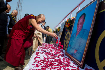 Guwahati, Assam, India, 2 February 2014 - A bright, warm sun shone in a cloudless blue sky as His Holiness drove to Guwahati’s Nehru Stadium this morning. He had been invited to give the first LBS Founders’ Commemorative Lecture on a ‘Human Approach to Peace’. As he was escorted into the stadium he encountered on either side a crush of people eager not only to catch a glimpse of him, but wielding their mobile phones to capture a picture too. He sat with other dignitaries as a group of traditional musicians played and sang a ‘borgeet’, a traditional Assamese song dating back to the 15th century.