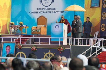His Holiness the Dalai Lama delivering the LBS Founders Commemorative Lecture on a "Human Approach to Peace" at Nehru Stadium in Guwahati, Assam, India on February 2, 2014. Photo/Tenzin Choejor/OHHDL