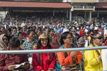 Some of the over 5000 people gathered at Nehru Stadium to listen to His Holiness the Dalai Lama deliver the LBS Founders Commemorative Lecture on a "Human Approach to Peace" in Guwahati, Assam, India on February 2, 2014.