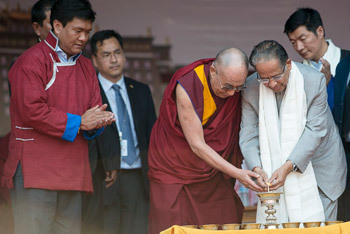 His Holiness the Dalai Lama and Assam Chief Minister Tarun Gogoi light a lamp to inaugurate the Festival of Tibet as Arunachal Pradesh Minister Pema Khandu (L) and Tibetan political leader Dr. Lobsang Sangay (R) look on in Guwahati, Assam, India on February 2, 2014. Photo/Tenzin Choejor/OHHDL