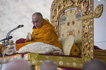 His Holiness the Dalai Lama with some Tibetan bread during a tea break in his teaching in Likir, Ladakh, J&K, India on July 1, 2014. Photo/Tenzin Choejor/OHHDL