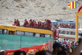 Some of the many monks that attended His Holiness the Dalai Lama's teaching leaving for their monasteries after the teaching in Likir, Ladakh, J&K, India on July 1, 2014.