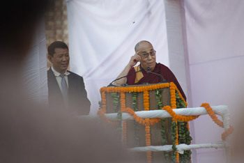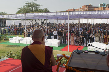 His Holiness the Dalai Lama delivering the 11th Nehru Memorial Lecture on "A Human Approach to World Peace" at Jawaharlal Nehru University in New Delhi, India on November 20, 2014. Photo/Tenzin Choejor/OHHDL
