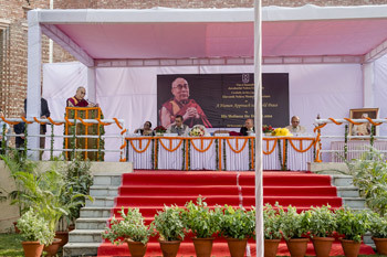 They then escorted him onto the daïs before an audience of more than 1200 gathered under a shamiana canopy because there were too many to be accommodated in the hall. Looking out over a sea of smiling faces, His Holiness waved. He was welcomed with warm applause.