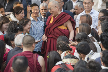 As the occasion reached its conclusion and His Holiness offered katags, silk scarves, to the participants, he explained that the gift has its roots in the Indian tradition of offering a shawl, that the silk material originated in China and that the auspicious verses inscribed upon it are Tibetan - a symbol of harmony. His Holiness released a new book containing talks he has given on secular ethics compiled by Renuka Singh. The pro-Chancellor, Prof. Prasenjit Sen’s words of thanks ended with an appeal to all concerned to serve human needs through education. On his way out, His Holiness was met by a group of Tibetan students at the university and he stopped briefly to give them encouragement and advice.
