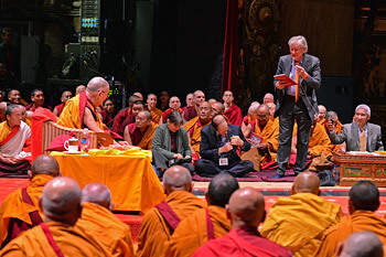 “Thurman first came to Dharamsala in 1964,” His Holiness told the capacity crowd of almost 3000. “He was dressed as a monk and had only one eye like Nagarjuna’s disciple Aryadeva. We’ve been close friends since then. He became a professor and has dedicated his academic career to elucidating Je Tsongkhapa’s teachings and aspects of the Gelugpa tradition. I often think we should look more at what unites us, like our common Nalanda University heritage rather than our diversity of meditational deity lineages and practices. The Sakya, Kagyu, Gelug, Nyingma, Jonang and Bonpo traditions all study the great classic Indian Buddhist texts. Je Tsongkhapa wrote about the great Indian texts and Thurman has taken special interest in that body of work. I’d like to acknowledge that here and thank him.”