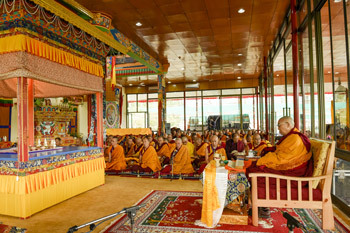 His Holiness clarified that he and the monks of Namgyal Monastery would continue the preparatory prayers and rituals for the next two days and that the preliminary teachings would take place 6-8th July in the morning. On 9th July, after lunch, the Namgyal monks will perform the Offering Dance. Local people, and anyone else who wishes to join in, are welcome to offer their own offering dances on that occasion too. The preliminary empowerment related to the Kalachakra will take place 10th July, while the actual empowerment will be given 11th and 12th July. On 13th July there will be a Longevity Empowerment for the disciples and an offering will be made for the Long Life of His Holiness.