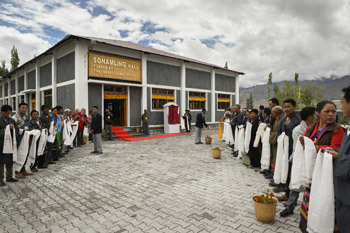 From the teaching ground His Holiness drove into the Tibetan Settlement at Choglamsar where, in the presence of the Leh DC, the Superintendent of Police, Minister for Urban Development, Rigzin Jora and the local Tibetan Representative, he inaugurated a new Tibetan Community Hall. This has been constructed with the financial support of The Dalai Lama Trust. Inside the hall he commented on some of the photographs on the wall. Of a photograph of himself with Pandit Nehru he noted that then he wore brocade robes, something he has given up since becoming a refugee. Of a photograph of his mother he remarked that she was incredibly kind and sowed the seeds of compassion in his own heart.