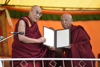 His Holiness the Dalai Lama presenting an award in gratitude to Gyen Lobsang Tenzin for his long dedication to the welfare and development of the TCV Schools at Choglamsar TCV School near Leh, Ladakh, J&K, India on July 3, 2014.
