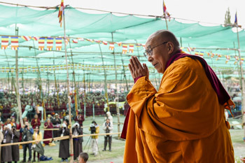 His Holiness the Dalai Lama acknowledging the crowd before his short teaching on the first day of the Kalachakra Empowerment in Leh, Ladakh, J&K, India on July 3, 2014. Photo/Manuel Bauer