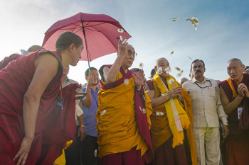 Mundgod, Karnataka, India, 25 December 2014 - Invited to inaugurate the new Drepung Gomang Mongolian Students' Hostel at that other end of the Mundgod Tibetan Settlement, His Holiness the Dalai Lama drove out of the Ganden Jangtse compound early this morning. He made a couple of other visits on the way.