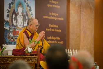 His Holiness the Dalai Lama during the final day of his three day teaching in New Delhi, India on March 23, 2014. Photo/Tenzin Choejor/OHHDL