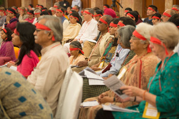 New Delhi, India, 23 March 2014 - On the final morning of a short series of teachings His Holiness the Dalai Lama has been giving in Delhi at the request of the Foundation for Universal Responsibility he gave a Trisamayavyuharaja empowerment. All seats in the hall were filled as more than 300 people sat quietly while His Holiness undertook the preparatory rituals. When he was ready he began to explain: