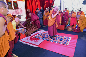 In response to a request from former Tibetan representative Tenzin P Atisha, His Holiness gave a reading transmission of a Chenresig prayer and advised his listeners to combine it with reading the ‘Three Principal Aspects of the Path’ and ‘Eight Verses for Training the Mind’. He emphasised the importance of study and advised that unless you transform the mind, you won’t attain the state of Chenresig.