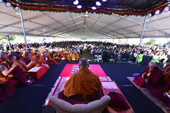 Leura, Blue Mountains, NSW, Australia, 7 June 2015 - Brilliant winter sun brought some warmth to the air as His Holiness the Dalai Lama took a short drive winding through the trees, up and down hills to the nearby town of Katoomba. Under the cover of a marquee about 1400 people, including more than 1000 Tibetans from Australia and New Zealand, 200 Vietnamese, nearly 60 Bhutanese, 10 Mongolians and others, had gathered to offer prayers for his long life. As the prayers went on traditional tea and sweet rice were served in biodegradable brown paper cups and bowls. At the end His Holiness addressed the gathering.