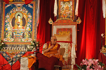 Back at the teaching venue in the afternoon His Holiness said that it was the usual custom at the beginning of a tantric teaching to make an appropriate ritual cake offering. On this occasion he suggested reciting the ‘6 Session Guru-Yoga’ together. During his preamble to explaining the Five Stages of Guhyasamaja, the translator, by a slip of the tongue, referred to a ‘Mister Nagarjuna’ instead of to ‘the Master Nagarjuna’, which made His Holiness roar with laughter.