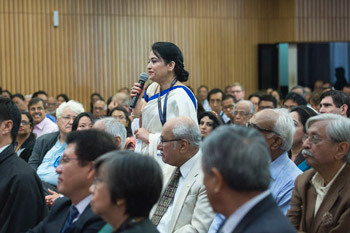 A female delegate from Bangladesh asked about the difficulties faced by women, even in democracy. His Holiness recounted how, when the need for leadership emerged in early human societies, physical strength was the main criterion, which led to male dominance. Today, with the development of education there is more equality and it is essential that more women give a lead. Another woman from Pakistan asked about developing greater trust between India and Pakistan and His Holiness encouraged greater people to people exchanges, which are a practical way to overcome the propaganda of vested interests.