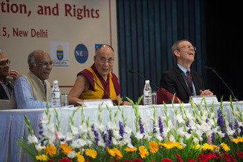 New Delhi, India, 23 March 2015 - It was a bright morning today as His Holiness the Dalai Lama arrived at the India International Centre to give the inaugural address at a conference on the theme - ‘Strengthening Democracy in Asia’.However, as Dr George Matthew made clear in his welcome speech, what made the event special was that it was being held to mark the legacy of veteran Indian activist and politician, George Fernandes. Since Fernandes’s failing health (he suffers from Alzheimer’s Syndrome and Parkinson’s disease) prevent his appearing in public, his friends wanted to hold a function to celebrate his legacy.