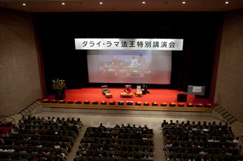His Holiness was offered a traditional Japanese lunch in the company of professors and teachers. He then walked to the hall where he was to give his talk to an audience of 3200, interacting with thrilled students on the way. The 2400 students in the hall gave him an enthusiastic welcome as he took the stage.