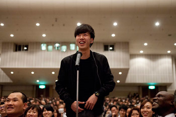 A member of the audience asking His Holiness the Dalai Lama a question during his talk at Aichi Gakuin University in Nagoya, Japan on April 7, 2015. Photo/Tenzin Jigmey
