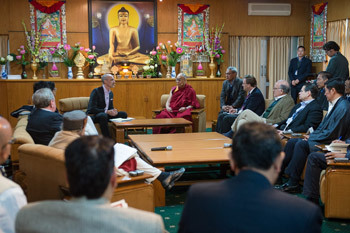 Theckchen Chöling, Dharamsala, HP, 4 November 2015 - This morning the American Enterprise Institute, a Washington DC based think tank, brought a delegation of 38 to meet His Holiness the Dalai Lama at his residence in Dharamsala. This is the second symposium the AEI has held with him. This time the theme is Abundance without Attachment.