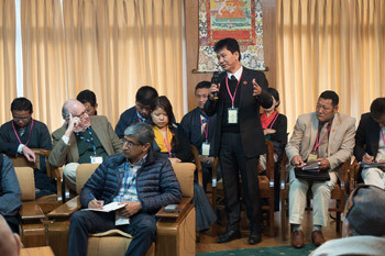 A Tibetan member of the audience commenting during the second panel discussion of the AEI Symposium at His Holiness the Dalai Lama's residence in Dharamsala, HP, India on November 4, 2015. Photo/Tenzin Choejor/OHHDL