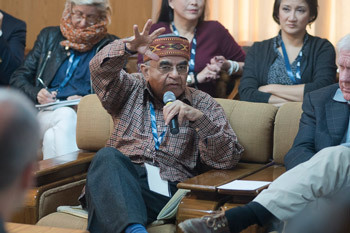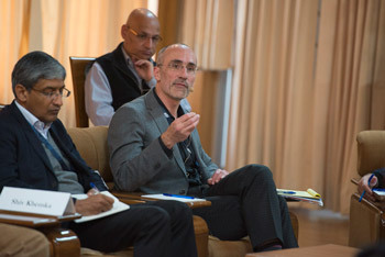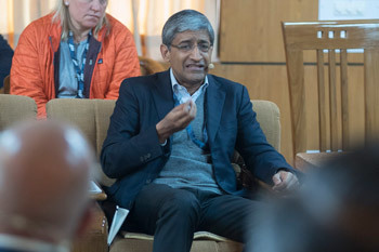 Gurcharan Das speaking during second panel of AEI's symposium with His Holiness the Dalai Lama in Dharamsala, HP, India on November 5, 2015. Photo/Tenzin Choejor/OHHDL