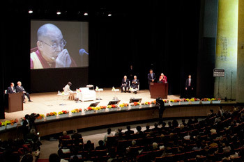 After lunch, he joined a panel taking part in a Global Environmental Forum for the Next Generation before an audience of 1100 at the Yomiuri Hall. Once introductions were complete, His Holiness was invited to speak.