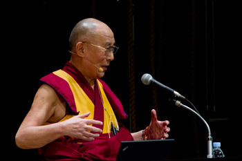 His Holiness the Dalai Lama speaking at the Global Environmental Forum for the Next Generation in Tokyo, Japan on April 6, 2015. Photo/Tenzin Jigmey