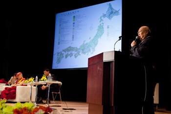 Nikawa Makoto, speaking on behalf of Akira Miyawakii about the 'Miyawakii method' of replanting forests with indigenous trees at the Global Environmental Forum for the Next Generation in Tokyo, Japan on April 6, 2015. Photo/Tenzin Jigmey