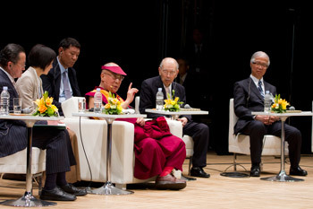 His Holiness the Dalai Lama commenting on the presentations during the Global Environmental Forum for the Next Generation in Tokyo, Japan on April 6, 2015. Photo/Tenzin Jigmey