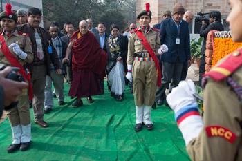 His Holiness the Dalai Lama walking to the stage escorted by National Cadet Corps members before his talk at University of Delhi's Kalindi College in New Delhi, India on January 28, 2015. Photo/Tenzin Choejor/OHHDL